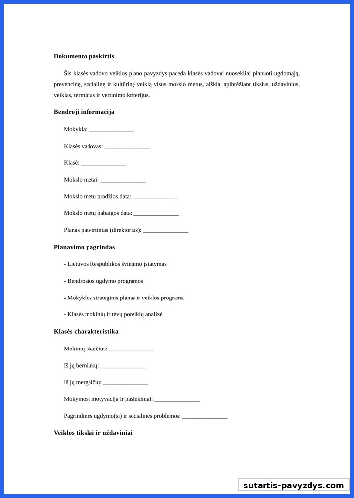 Klasės Vadovo Veiklos Planas Pavyzdys
